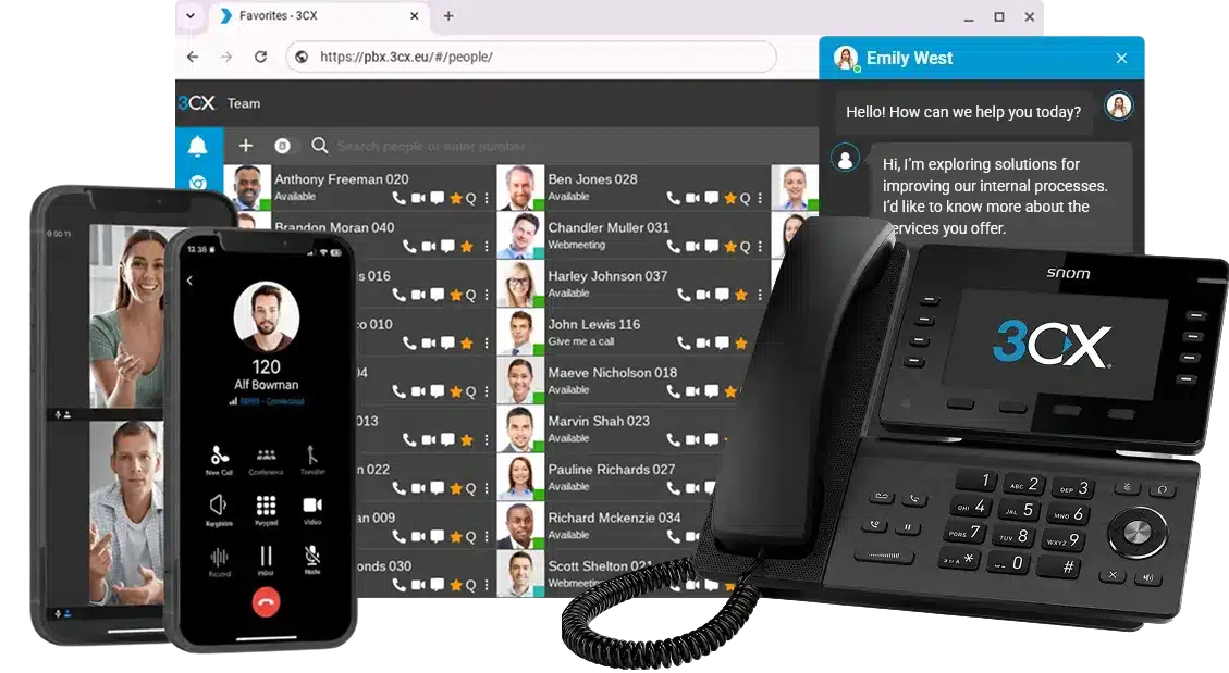 3CX is a feature-rich unified communications system for enterprise business, offering voice, video, live chat, and messaging. It works for remote, hybrid, and office-based teams, enabling communication across all channels in one platform.